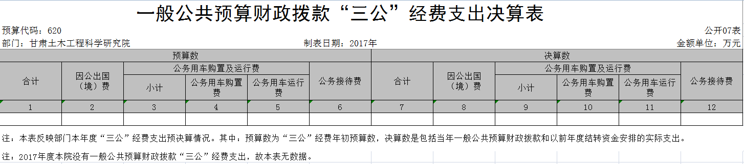 2017 年度本院“三公”经费支出共计0万元,较年初预算数增加0万元,与上年同期持平。因为2017年预算中未安排“三公”经费支出,本院严格按照预算没有发生相关费用和支出。
