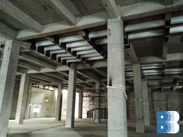从2015年11月下旬开始,我院钢结构研发中心在招投标工作结束之后,及时对施工图深入细化,优化施工方案,科学展开各项施工作业。整个项目的重点和难点在于对地上一、二层顶板H型钢梁进行加固,以及钢梁端部原框架梁碳纤维的加固补强等方面。为此,研发中心的技术人员分别采用了钢结构钢梁制作安装、对框架梁进行碳纤维加固等方式。
