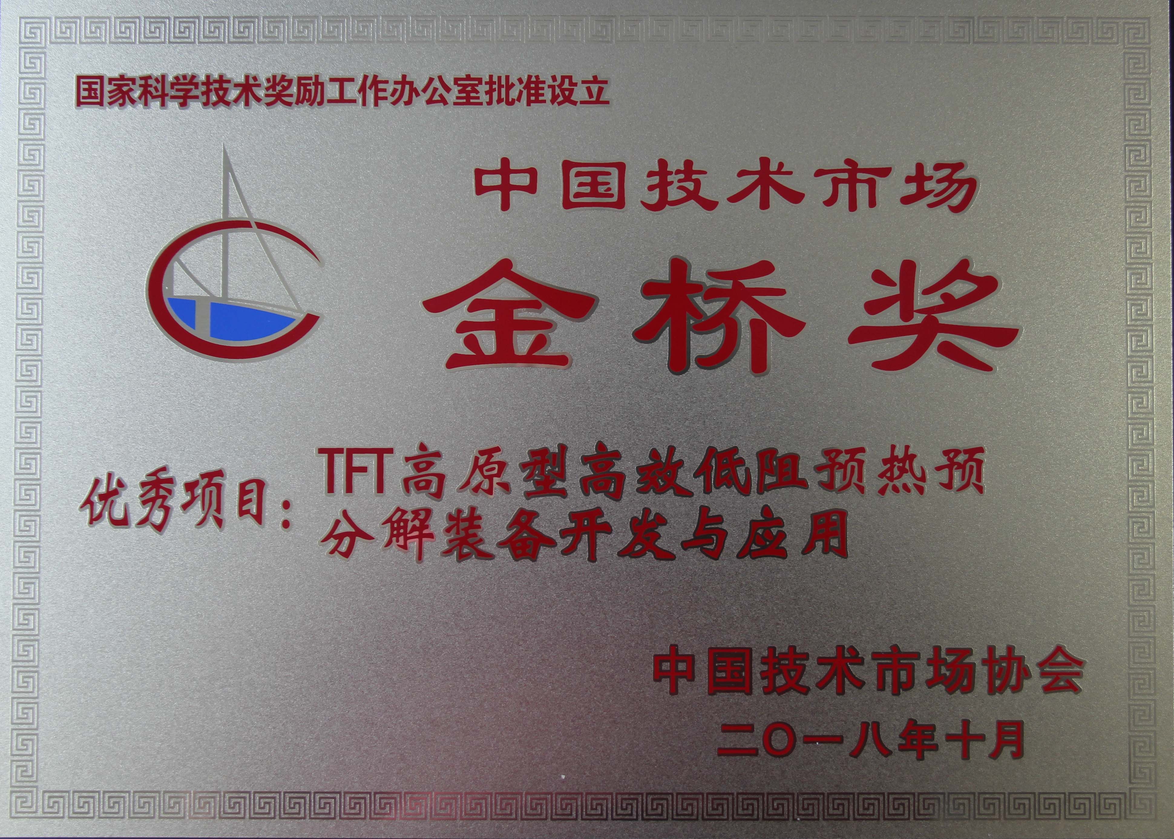 第九届中国技术市场协会金桥奖颁奖大会于2018年10月31日在北京召开,我公司继上届荣获先进集体奖后,今年申报的“TFT高原型高效低阻预热预分解装备开发与应用”项目经第九届中国技术市场协会金桥奖评审委员会评审,荣获优秀项目奖。