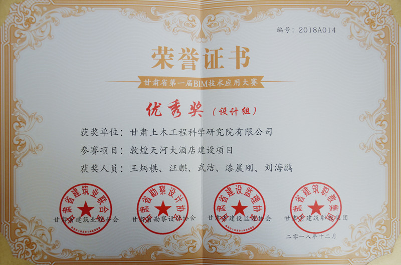 由甘肃省建筑业联合会、甘肃省勘察设计协会、甘肃省建设监理协会、甘肃省建筑职教集团主办的甘肃省第一届BIM技术应用大赛颁奖典礼于近日举行,由我公司建筑设计中心王炳棋、汪麒、武洁、漆晨刚、刘海鹏几位专业技术人员负责的“敦煌天和大酒店建设项目”BIM技术优化设计获得设计组优秀奖。