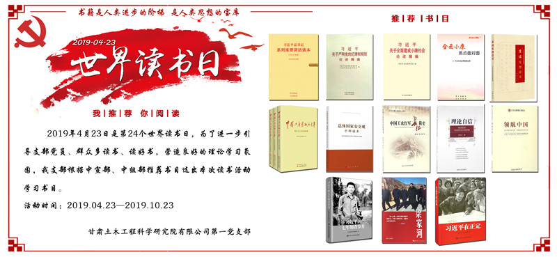 2019年4月23日适逢第24个世界读书日,为了进一步引导支部党员、群众多读书、读好书,营造良好的理论学习氛围,我支部根据中宣部、中组部推荐书目选出本次读书活动学习书目。