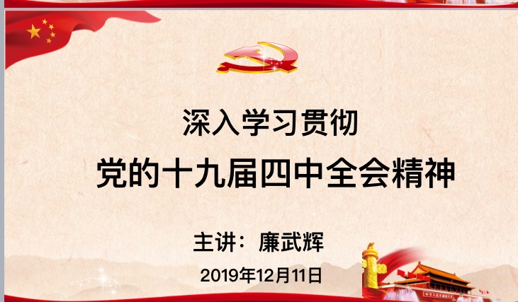 为贯彻落实公司党委指示精神,12月11日下午,第一、三、四党支部联合开展“深入学习十九届四中全会精神”的主题党日活动,邀请西北民族大学马克思主义学院副教授,硕士研究生导师,形势与政策教研室主任廉武辉进行宣讲。