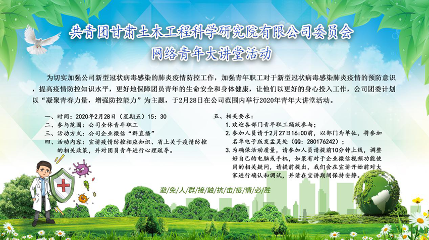 2月28日,公司团委主办的“网络青年大讲堂” 以在线直播的方式在土木院企业微信群开讲,共有近百名青年团员收看了直播。