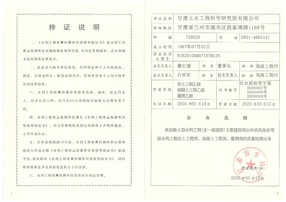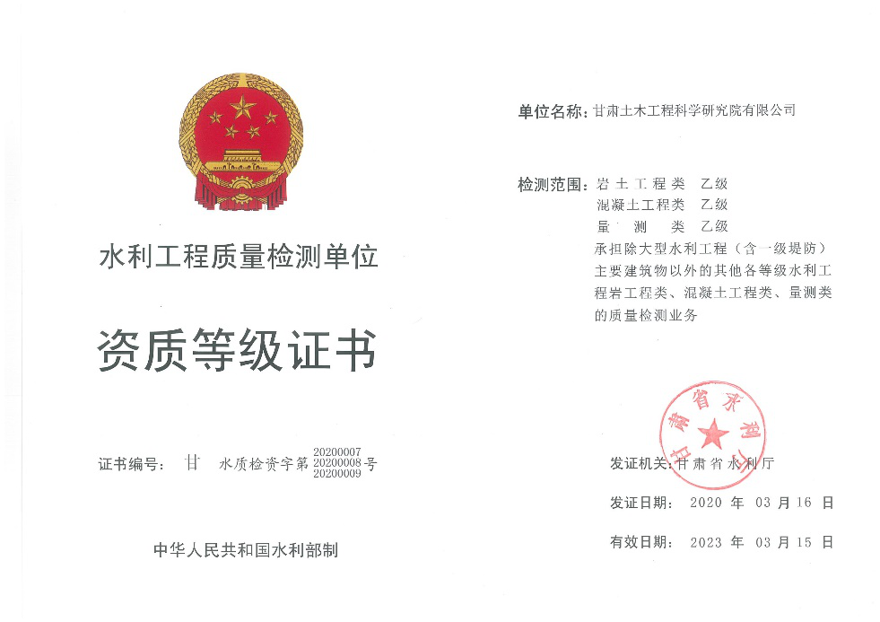 3月16日,公司申报的水利工程质量检测资质获得审批,取得岩土工程类乙级、混凝土工程类乙级、量测类乙级资质证书。