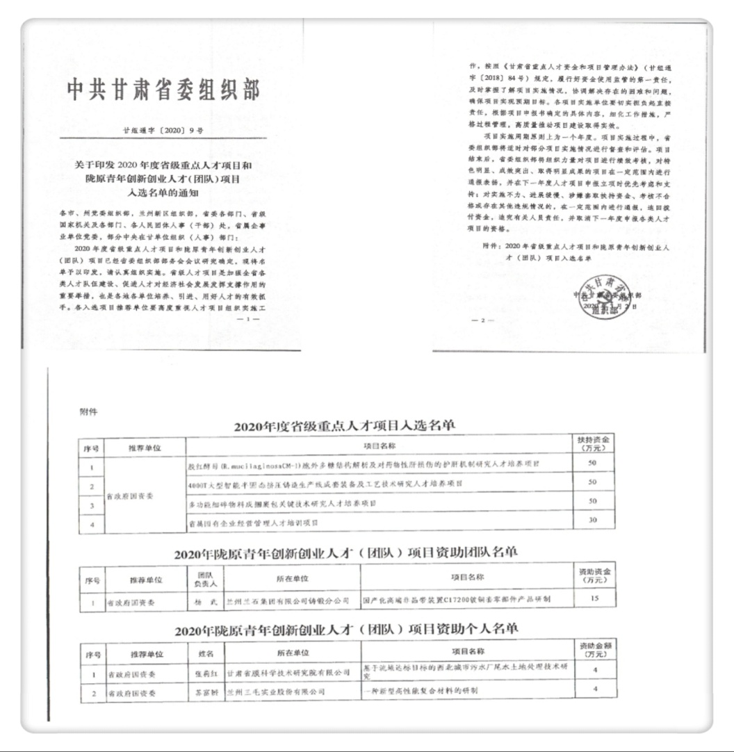 陇原青年创新人才计划是中共甘肃省委、甘肃省人民政府加强全省各类人才队伍建设、促进人才对经济社会发展发挥支撑作用的重要举措,此次入选将对我公司高性能复合材料项目的深度研发及推广应用起到积极的促进作用,并将有力助推公司人才队伍建设和科技研发,进一步增强公司服务地方经济社会发展的能力。