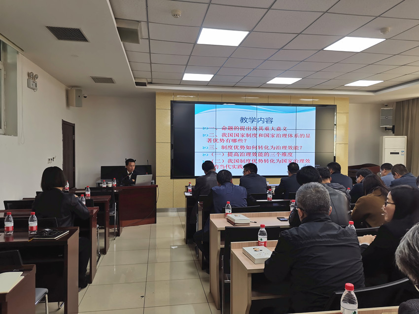 省委党校教授曹建民通过鲜明生动的事例总结概括了中国特色社会主义制度的十三个显著优势,并对如何强化制度执行力,加强制度执行的监督等方面进行了讲解,通过对这一专题知识的学习,广大党员及入党积极分子更加深刻的了解到中国特色社会主义民主政治的制度优势与治理效能日益凸显。