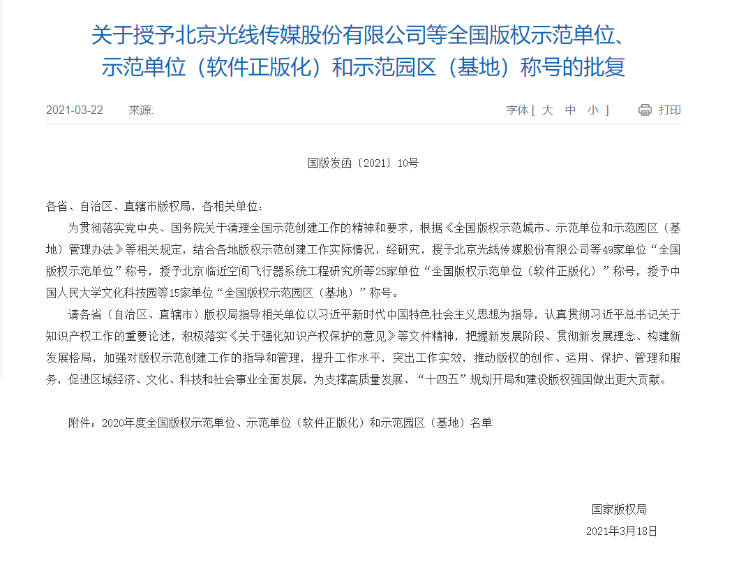 2021年3月18日,国家版权局正式发文授予我公司“2020年度全国版权示范单位(软件正版化)”荣誉称号。全国有25家单位获此称号,我公司是甘肃省唯一一家获此殊荣的单位。本次荣誉的授予,是国家版权局对认真贯彻《国家知识产权战略纲要》,深入实施创新驱动发展战略,强化知识产权创造、运用、保护和管理先进单位的表彰;更是对我公司全体职工在软件正版化方面工作的肯定。
