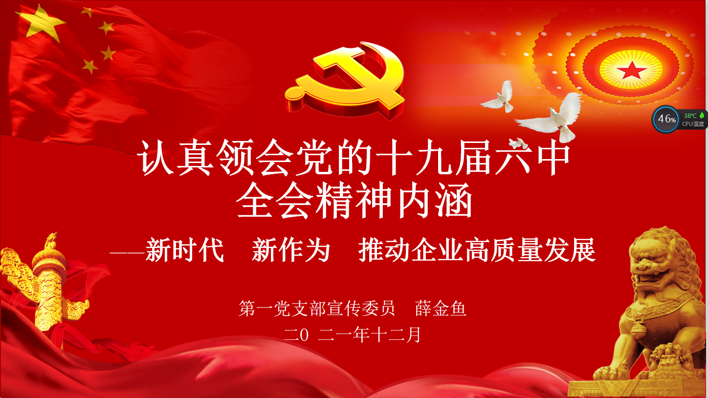 2021年12月15日下午,第一党支部在公司第一会议室开展了支部委员讲党课活动,宣传委员薛金鱼同志以《认真领会当的十九届六中全会精神内涵》为题,为第一支部全体党员及入党积极分子上了一堂主题鲜明、富有教育意义的党课。