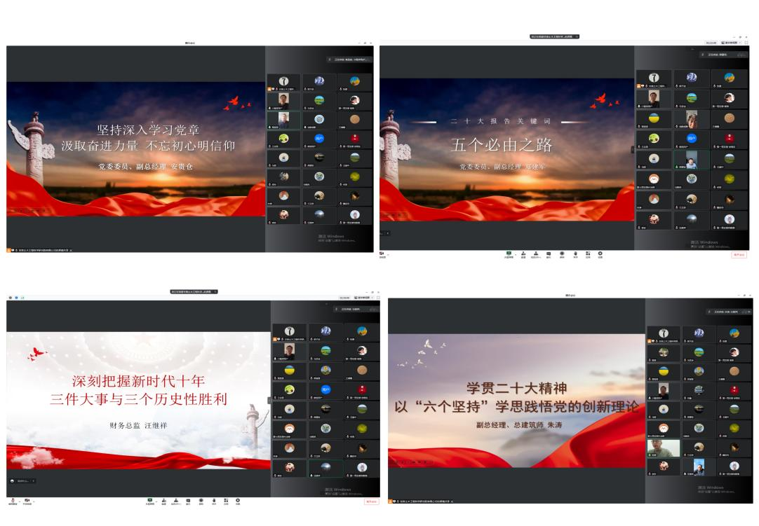 会议围绕党章、“五个必由之路”、新时代十年三件大事与三个历史性胜利及“六个坚持”的创新理论等方面对党的二十大精神开展了专题宣讲。领导班子成员安贵仓、郑建军、汪继祥、朱涛分别结合工作实际,从不同角度对党的二十大报告进行了重点阐释。最后,党委书记、董事长董红健以“牢记初心使命 深化自我革命”,党委副书记、董事、总经理马灵会以“坚持以推动高质量发展为主题贯彻新发展理念、服务新发展格局”为题,紧密结合各自思想和工作实际进行了交流发言,谈学习心得体会,谈推进工作的思路举措,一致表示要发挥好领导干部“先学一步、深学一层”的表率作用,深学细悟新思想、对标对表新部署、团结奋斗新征程,深刻领悟“两个确立”的决定性意义,不断增强“四个意识”、坚定“四个自信”、做到“两个维护”,以实际行动为企业高质量发展不懈努力。