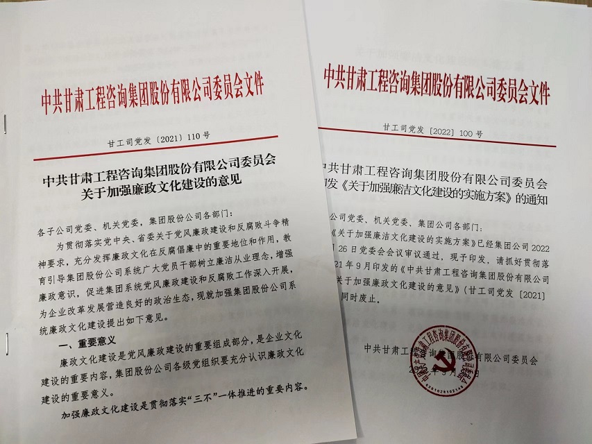 作为新组建的产业集团,甘肃工程咨询集团把资产整合、产业耦合和文化融合作为集团公司组建的重要内容,其中让廉洁文化建设在企业文化建设中先行一步,早安排早部署,2021年9月集团公司党委研究印发《关于加强廉政文化建设的意见》,在中共中央办公厅《关于加强新时代廉洁文化建设的意见》和省委《实施方案》印发后,又及时对标、查缺补漏,2022年9月修订印发《关于加强廉洁文化建设的实施方案》,为新时代集团公司加强廉洁文化建设提供了指导。自组建以来,集团公司廉洁文化建设力求在“内化于心”上下功夫,在“外化于行”上求实效,引导干部职工廉洁从业,廉洁用权,积极营造“崇廉、尚廉、倡廉、守廉”的企业风尚和发展氛围。