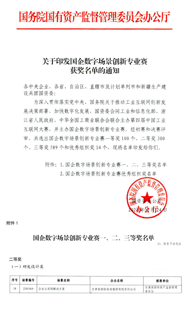 近日,国务院国资委公布了首届“国企数字场景创新专业赛”获奖名单。甘肃工程咨询集团组织推荐的“甘招企业云采购平台”创新场景,在全国2007家参赛企业推荐的3277个场景中脱颖而出,荣获二等奖!