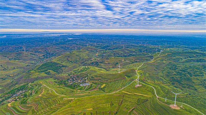 梯田蜿蜒起伏,村庄错落有致,云海连绵不绝,风车悠然旋转,织就了人与自然和谐共生的美丽画卷。