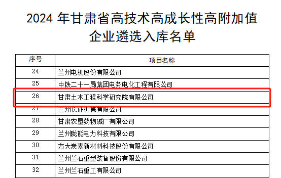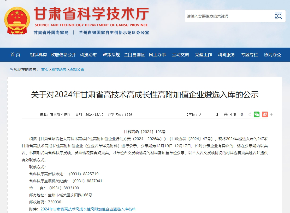 近日,甘肃省科技厅发布《关于对2024年甘肃省高技术高成长性高附加值企业遴选入库的公示》,我公司成功入选甘肃省高技术高成长性高附加值(简称“三高”)企业名单。