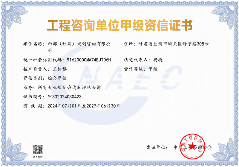 6月下旬,经中国工程咨询协会评审,甘肃工程咨询集团旗下西部(甘肃)规划咨询有限公司,成功取得工程咨询单位综合甲级资信和7项专业甲级资信,实现了我省工程咨询“综甲”从无到有的历史性突破。西部(甘肃)规划咨询公司是甘肃工程咨询集团着眼深化改革、优化资源配置、培育发展新业务而创建的综合咨询技术服务企业。公司围绕贯彻落实国家重大战略和全省发展规划,组建专家智库团队,主动开展战略性、前瞻性研究,先后高质量完多项重大咨询任务。