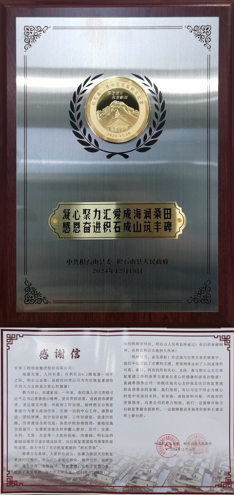 “患难方见真情,大爱积石成山。在聚力推进灾后恢复重建的过程中,甘肃工程咨询集团心系受灾群众、倾力付出,提供技术,毫无保留,全程指导,帮助重建,贡献了智慧力量、提供了重要帮助。你们的无私大爱,我们将永远感激!你们的艰辛付出,积石山人民将始终铭记!你们的奉献精神,也将在积石大地恒久传承!”