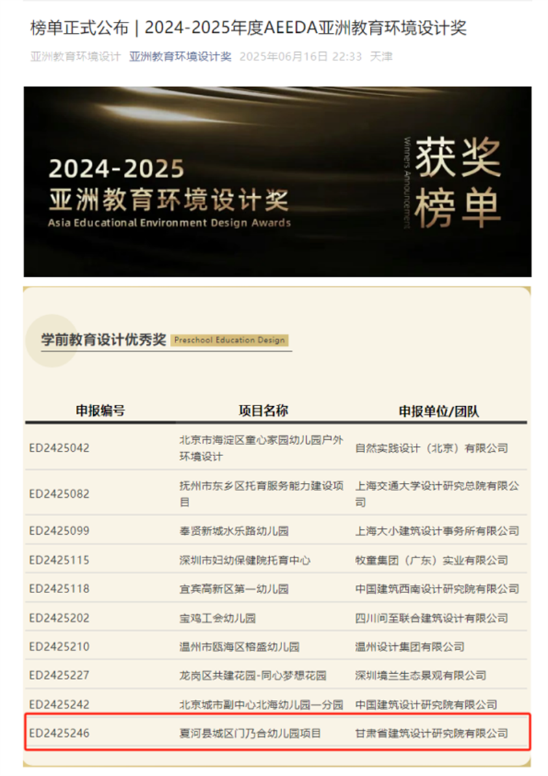 近日,备受瞩目的2024-2025年度AEEDA亚洲教育环境设计奖(Asia Educational Environment Design Awards)获奖名单正式揭晓。由甘肃工程咨询集团旗下省建筑设计院设计的夏河县城区门乃合幼儿园项目,从百余件参赛作品中脱颖而出,荣膺学前教育设计领域优秀奖,为甘肃建筑设计行业赢得了国际声誉。