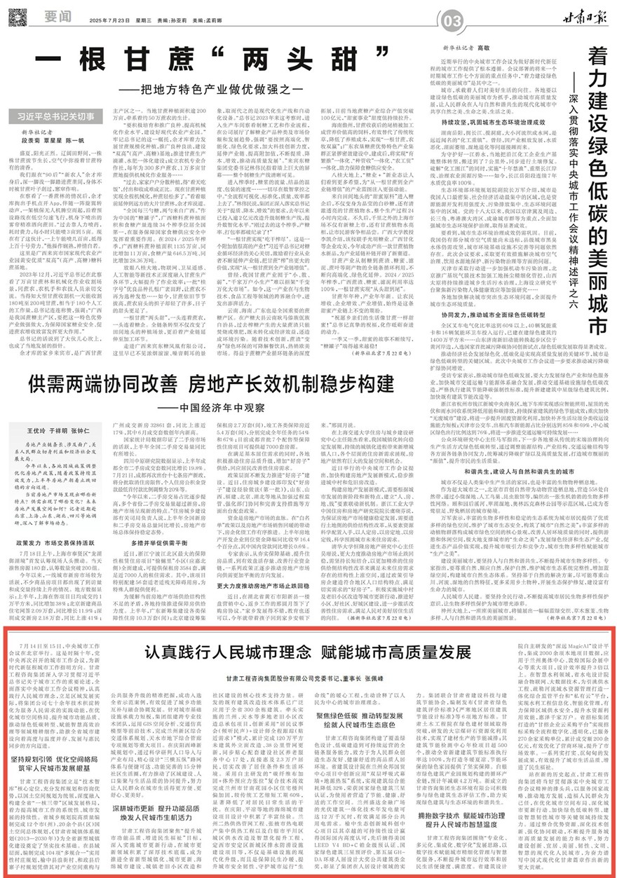 7月14日至15日,中央城市工作会议在北京举行。这是时隔十年,党中央再次召开的城市工作会议,为新时代新征程城市工作指明方向。甘肃工程咨询集团深入学习贯彻习近平总书记关于城市工作的重要论述,全面落实中央城市工作会议精神,认真践行人民城市理念,立足区域发展实际,将集团公司七十余年技术积淀转化为服务人民需求的实践动能,在优化城市空间格局、提升城市功能品质、推动绿色低碳转型、赋能智慧高效治理等领域精耕细作,助推全省城市建设向着高度与温度并存、发展与惠民同步的方向迈进。
