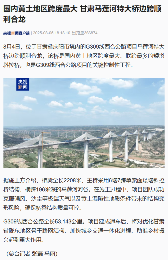 该桥是我国黄土地区跨度最大、联跨最多的矮塔斜拉桥,其建设难度和技术要求均属行业领先水平。项目实施过程中,甘肃工程咨询集团监理团队充分发挥专业技术优势,严格履行监理职责,与各参建单位通力协作,克服了黄土地区地质条件复杂、施工技术难度大等挑战,为工程质量和进度提供了坚实保障。项目的顺利推进,充分展现了集团在大型交通工程监理领域的专业实力。未来,甘肃工程咨询集团将继续秉持"质量第一、安全至上"理念,为全省交通基础设施建设贡献智慧力量。