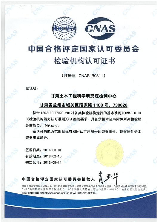2012年2月首次依据CNAS-CL01建立了检验机构质量管理体系,2012年8月初次通过国家检验机构认可,检验领域为建筑地基(地基、桩基承载力试验与评价)、建筑结构(工程施工质量评价、结构设计复核、结构抗震性能评价、结构安全性与可靠性评价)、建筑节能(围护结构节能性能施工质量及评价、建筑物能耗及节能综合指标评价)、混凝土(混凝土配合比质量评定、混凝土质量和生产过程质量控制评定)。历经监督检查,换证复评审,持续有效运行5年。