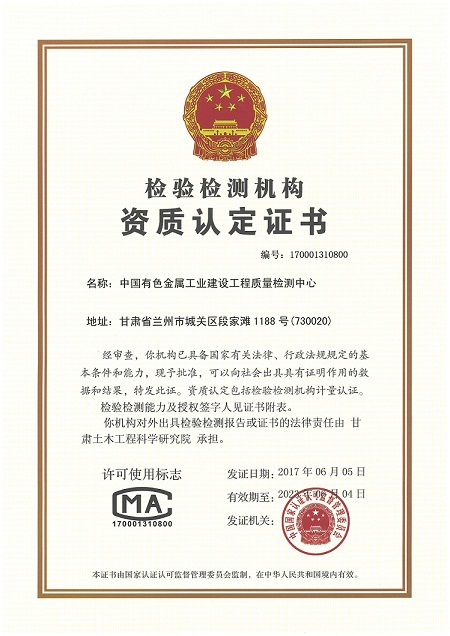 中国有色金属工业建设工程质量检测中心自1995年初次通过国家级检验检测机构资质认定,法律地位明确,组织机构健全,人员能力、仪器设备配置、场所环境条件等均满足检验检测工作要求。具备建筑材料、岩土工程、工程结构、建筑节能、室内环境、钢结构检测能力,通过了17类产品,147个参数的检测能力认定。期间经历多次监督评审、换证复评审,持续有效运行25年。