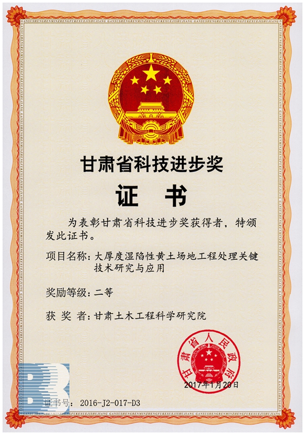 《大厚度湿陷性黄土场地工程处理关键技术研究与应用》(2016年度甘肃省科技进步二等奖)