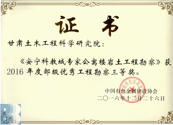 《安宁科教城专家公寓楼岩土工程勘察》(2016年度部级优秀工程勘察三等奖)